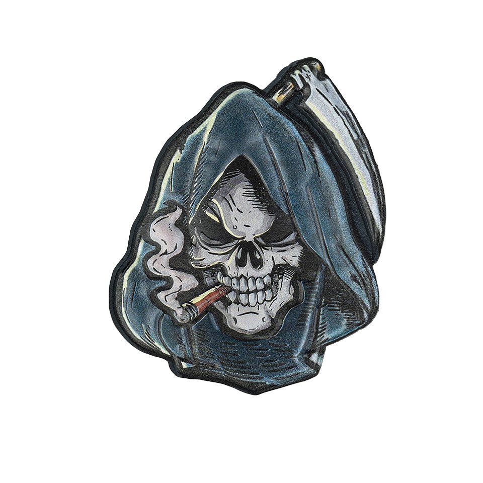 Plastová velcro 3D nášivka lebky so zapálenou cigarou, v kapucni a s kosou – smrtka.