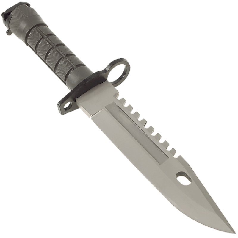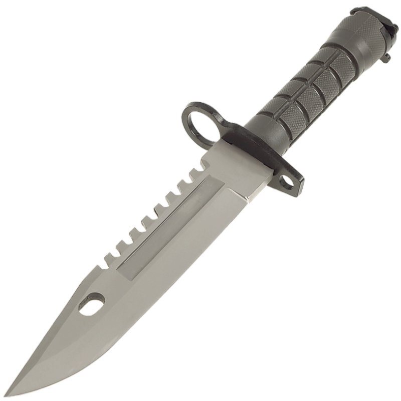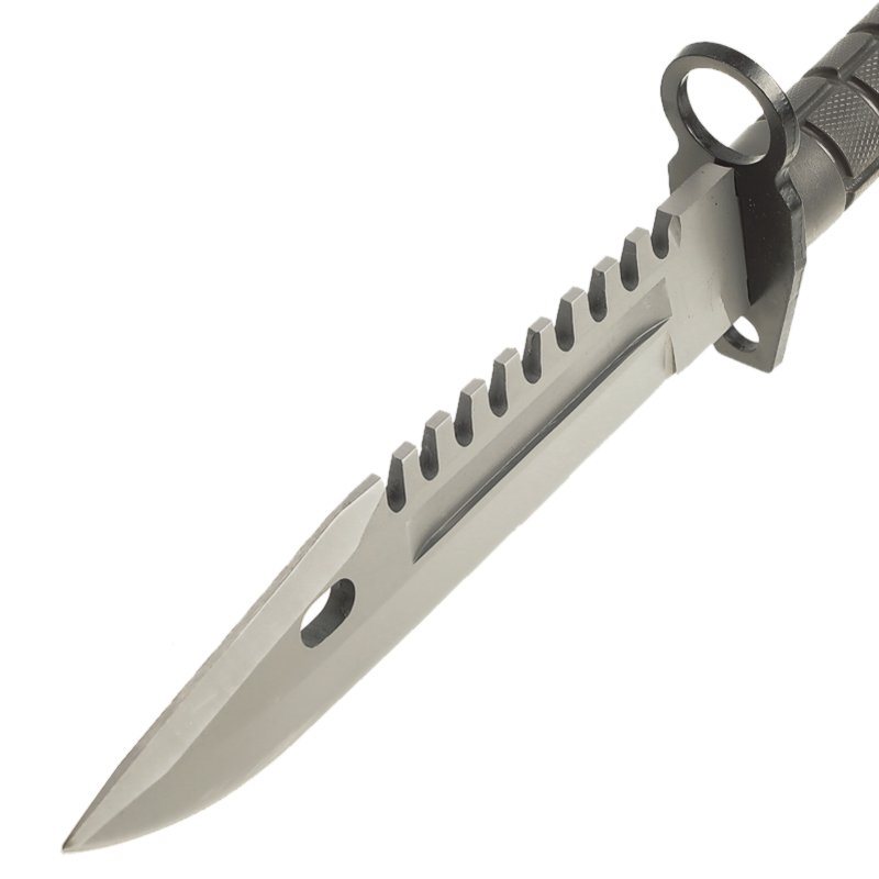 Robustný bajonet vyrobený podľa klasickej predlohy, ktorá do služby v americkej armáde vstúpila v roku 1986. Rovnako ako predloha, aj tento nôž disponuje robustnou konštrukciou vhodnou pre celý rad úkonov. Čepeľ noža s hladkým ostrím je vyrobená z húževnatej nerezovej ocele 420, pričom na jej chrbte nájdete pílku a v prednej časti otvor slúžiaci v kombinácii s puzdrom na štiepanie drôtov. Kovová záštita noža slúži nielen na fixáciu noža na útočnú pušku, ale aj na ochranu ruky pri práci. Rukoväť je vyrobená z tvrdeného plastu s protišmykovou textúrou zaisťujúcou pevný úchop vo všetkých podmienkach. K nožu je dodávané robustné opaskové puzdro s pevnou plastovou prackou.