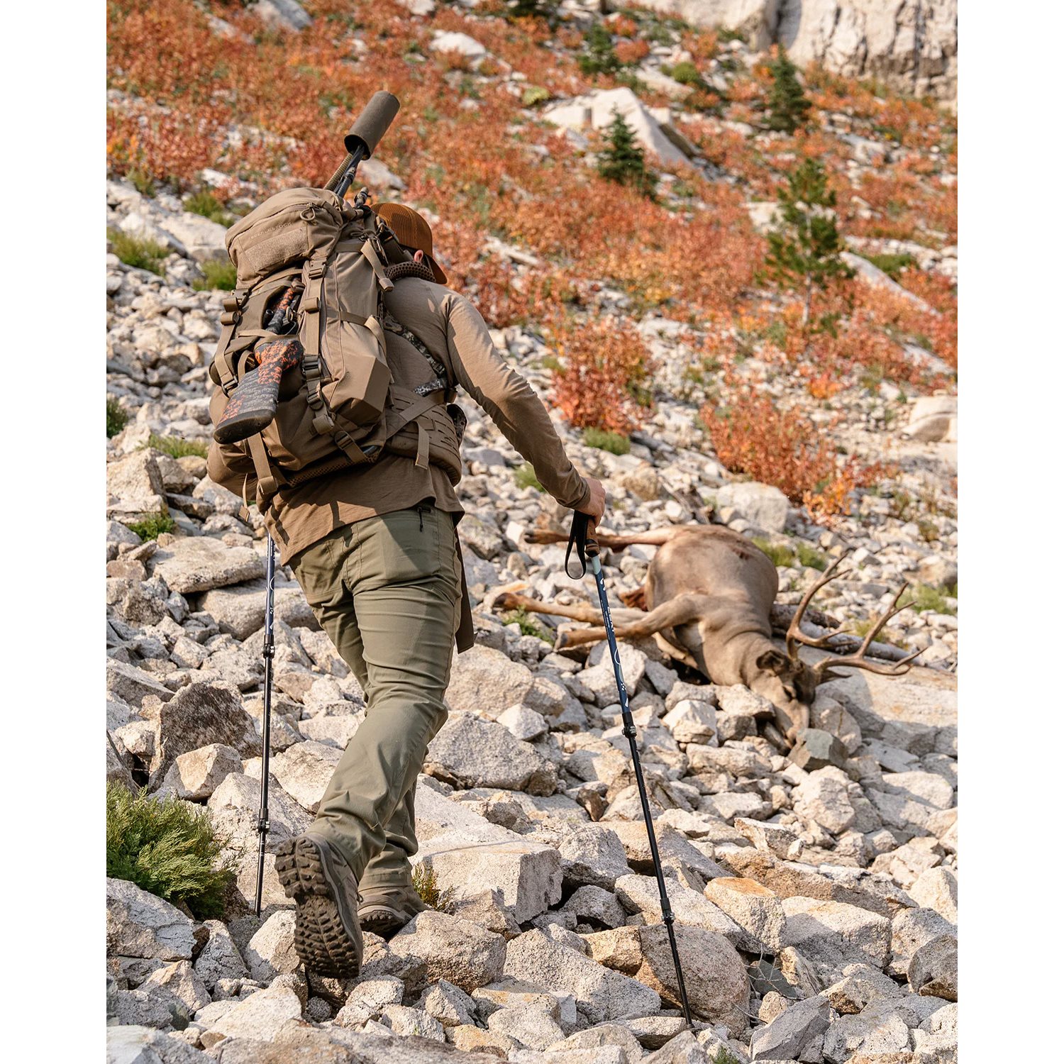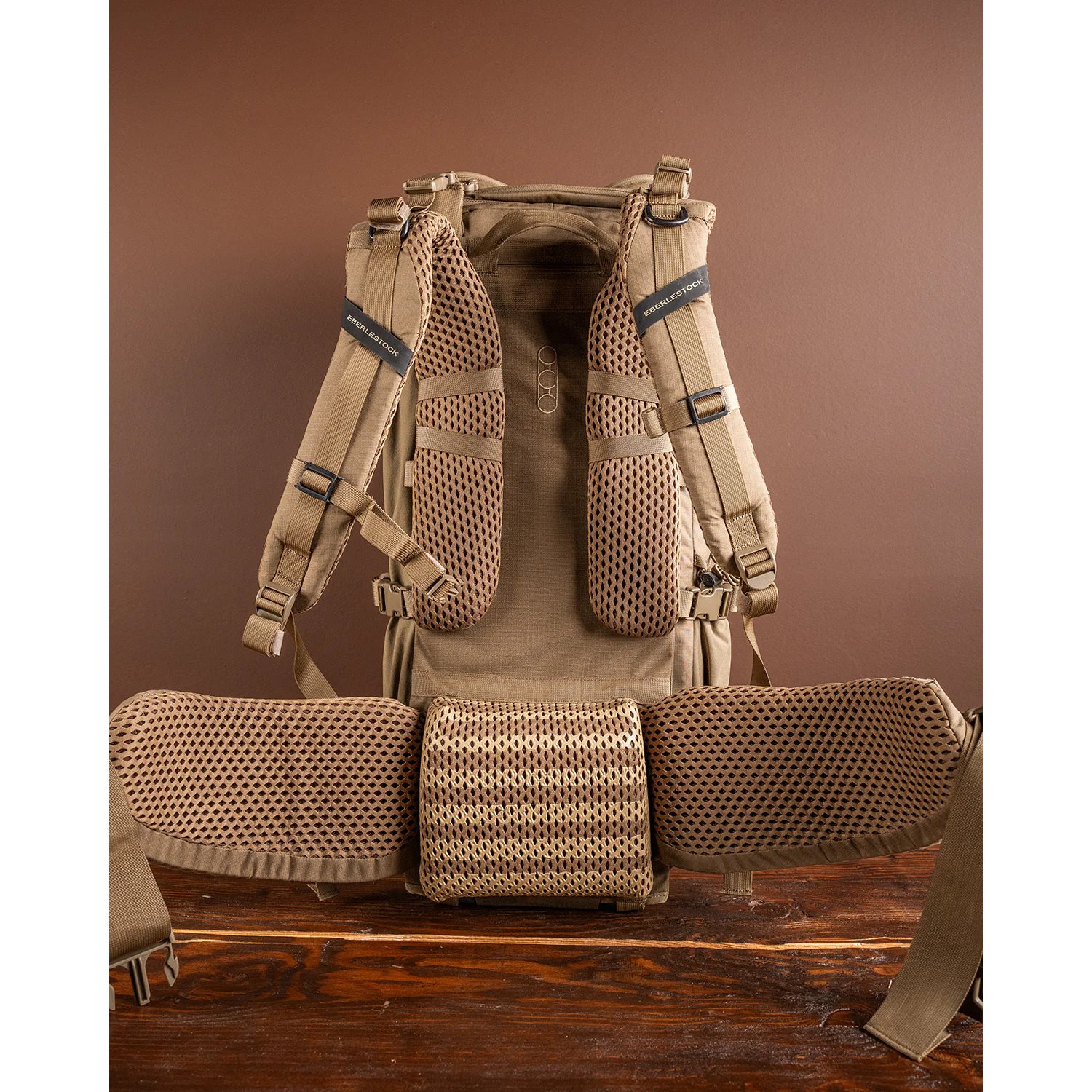 Hliníkový nosný systém je tvarovaný tak, aby poskytoval maximálnu oporu chrbta. V prípade potreby je možné batoh úplne odstrániť a chrbtový systém používať samostatne alebo v kombinácii s iným kompatibilným príslušenstvom z produktovej rady EMOD HUNT od spoločnosti EBERLESTOCK. Ramenné popruhy sú vybavené stabilizačnými zarážkami, elastickým hrudným popruhom a dajú sa výškovo nastaviť podľa potrieb používateľa. Bedrový pás má naozaj hrubú silikónovú podložku, ktorá zabraňuje skĺznutiu batohu pri dynamickom pohybe. Bočné strany bedrového pásu sú tiež silne polstrované a zapínajú sa pomocou pevnej plastovej pracky.