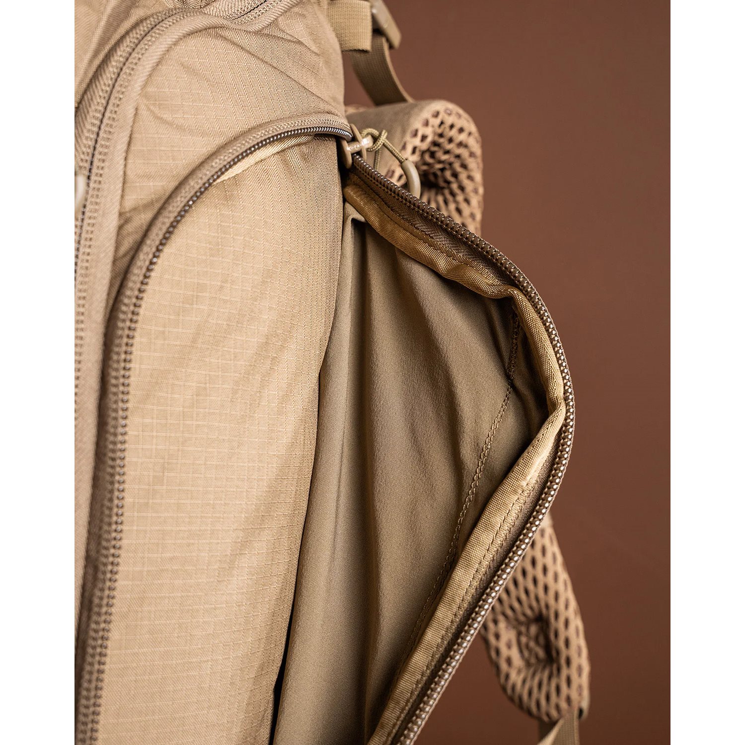 Bočné strany batohu sú asymetrické. Jedna strana má čiastočne elastické vrecko na fľašu, zatiaľ čo druhá strana má predĺžené elastické vrecko prístupné cez obojsmerný zips. Na oboch stranách sú pevné kompresné popruhy. Predná strana má pár elastických priehradiek a ďalší pár kompresných popruhov. Horné vrecko pri vchode je pomerne malé, takže je ideálne na dôležité veci, ktoré chcete mať po ruke. Hlavný vchod do vnútornej časti batohu je zakrytý odnímateľným vekom s dvoma vreckami a pomerne veľkým panelom VELCRO na personalizáciu pomocou suchých zipsov.