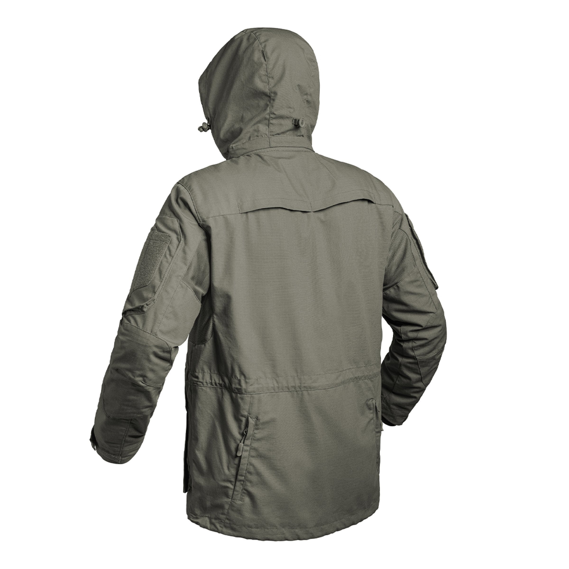 Bunda s kapucňou FIGHTER od francúzskeho výrobcu A10 equipment je inšpirovaná vojenskými modelmi a spája v sebe odolnosť, pohodlie a praktickosť. Je vyrobená z tkaniny ošetrenej technológiou Ripstop 5.0 a je tiež ošetrená teflónom, ktorý zaisťuje odolnosť proti vode, nečistotám a škvrnám, a je navyše vybavená technológiou IR-PROTECT na ochranu v infračervenom spektre. Bunda sa zapína na dvojcestný zips a v páse má suchý zips. Hlavné švy sú dvojito prešité a lakte sú pre väčšiu odolnosť vystužené.