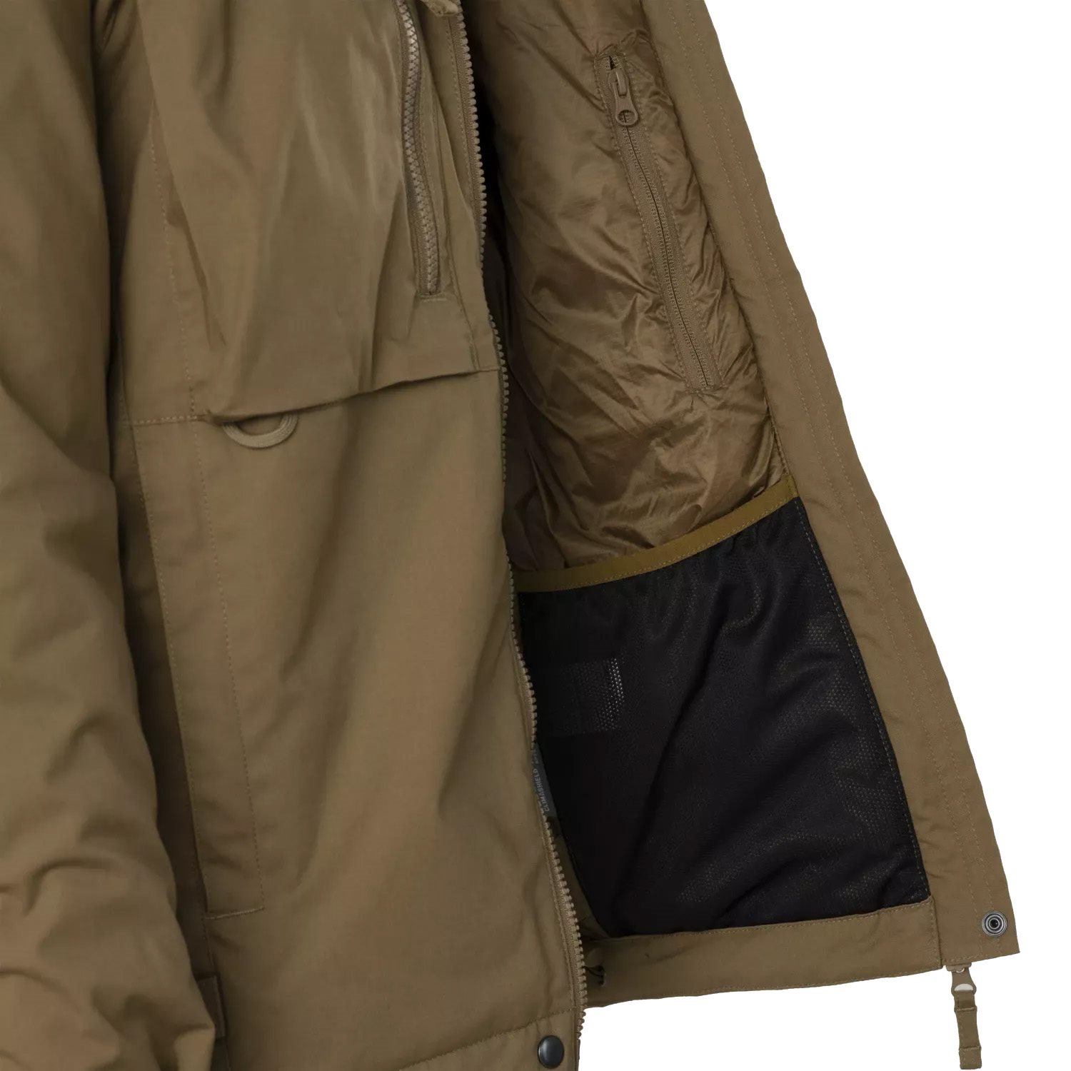 Všetky zipsy na bunde sú vysokokvalitné zipsy YKK a bunda sa zapína centrálnym obojsmerným zipsom doplneným o patentku v páse. Bunda má tiež sieťované vetranie pod pazuchami. Kapucňa sa dá ľahko nastaviť pomocou elastického sťahovacieho šnúrky so zarážkou a trojbodové nastavenie umožňuje, aby perfektne sedela na každej hlave. Bunda má celkom osem vreciek na uloženie cenností a drobností. Vrecká na hrudi majú vnútorný organizér a zapínajú sa na zipsy. Pod týmito vreckami nájdete pár vreciek na ruky podšitých teplým flisom. Na ľavom ramene je veľké vrecko s vonkajším panelom VELCRO na personalizáciu nášivkami. Zostávajúce tri vrecká (z toho dve zo sieťoviny) sú vo vnútri bundy a sú dostatočne veľké, aby boli prístupné aj pri nosení rukavíc. Pod vreckami na hrudi sú slučky z paracordového lana na pripevnenie kompasu alebo iných malých predmetov. Na koncoch rukávov sú manžety na suchý zips pre individuálne nastavenie. Pás je možné stiahnuť pomocou elastických šnúrok so zarážkami, aby sa zabránilo nežiaducemu prenikaniu vetra. Po bokoch bundy nájdete niekoľko modulárnych priehradiek MOLLE/PALS.