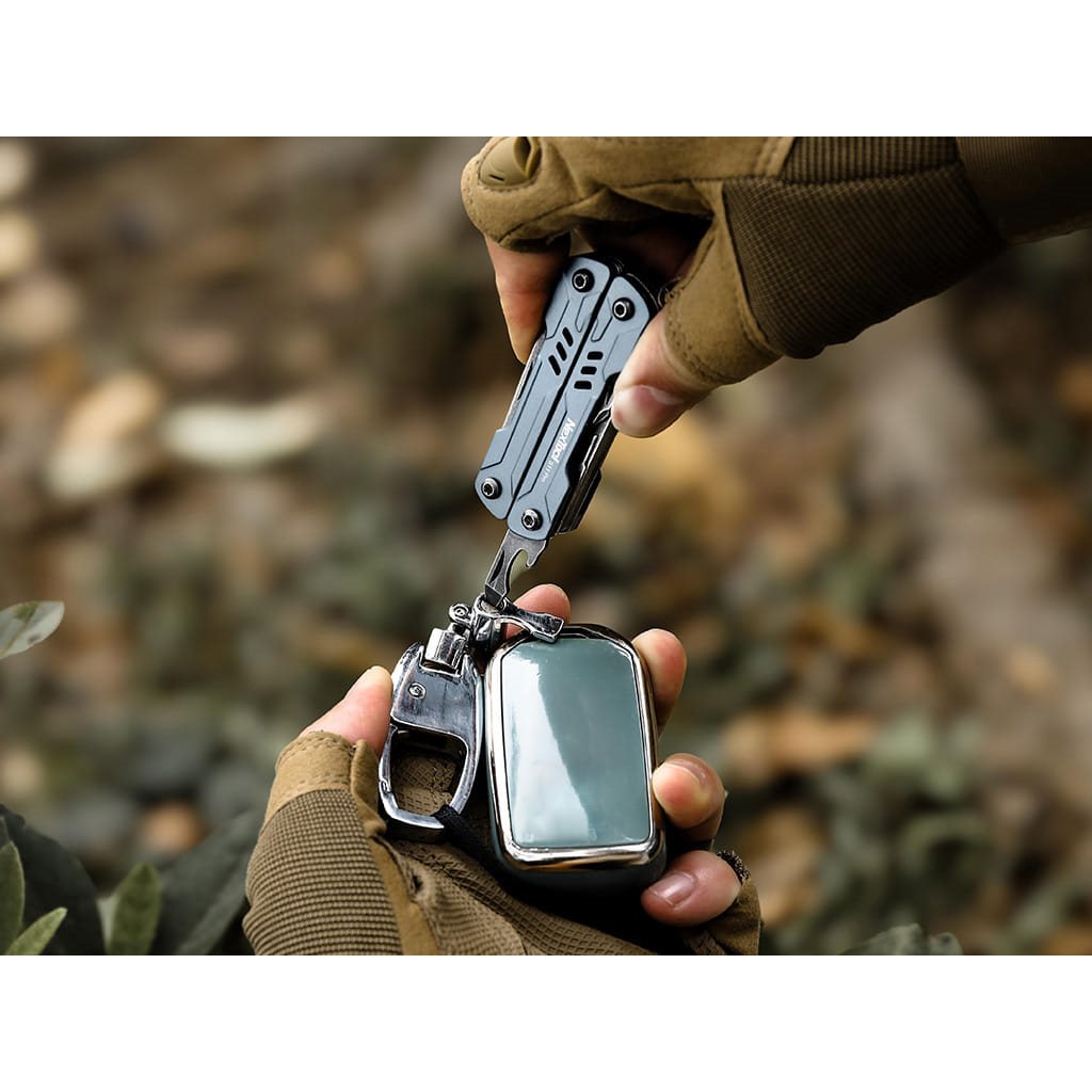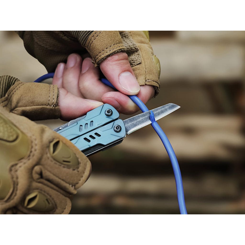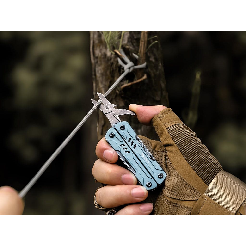 Ultrakompaktné multifunkčné kliešte vybavené celou radou praktických nástrojov. Telo klieští je vyrobené z nehrdzavejúcej ocele 20Cr13, zatiaľ čo rukoväť je vyrobená z ľahkého, ale odolného hliníka 5052. Nástroje majú tmavú povrchovú úpravu stonewash, zatiaľ čo rukoväť je kontrastnej modrej farby. Vďaka svojej minimálnej veľkosti sa kliešte ľahko zmestia do vrecka alebo ich môžete pripnúť na kľúče.