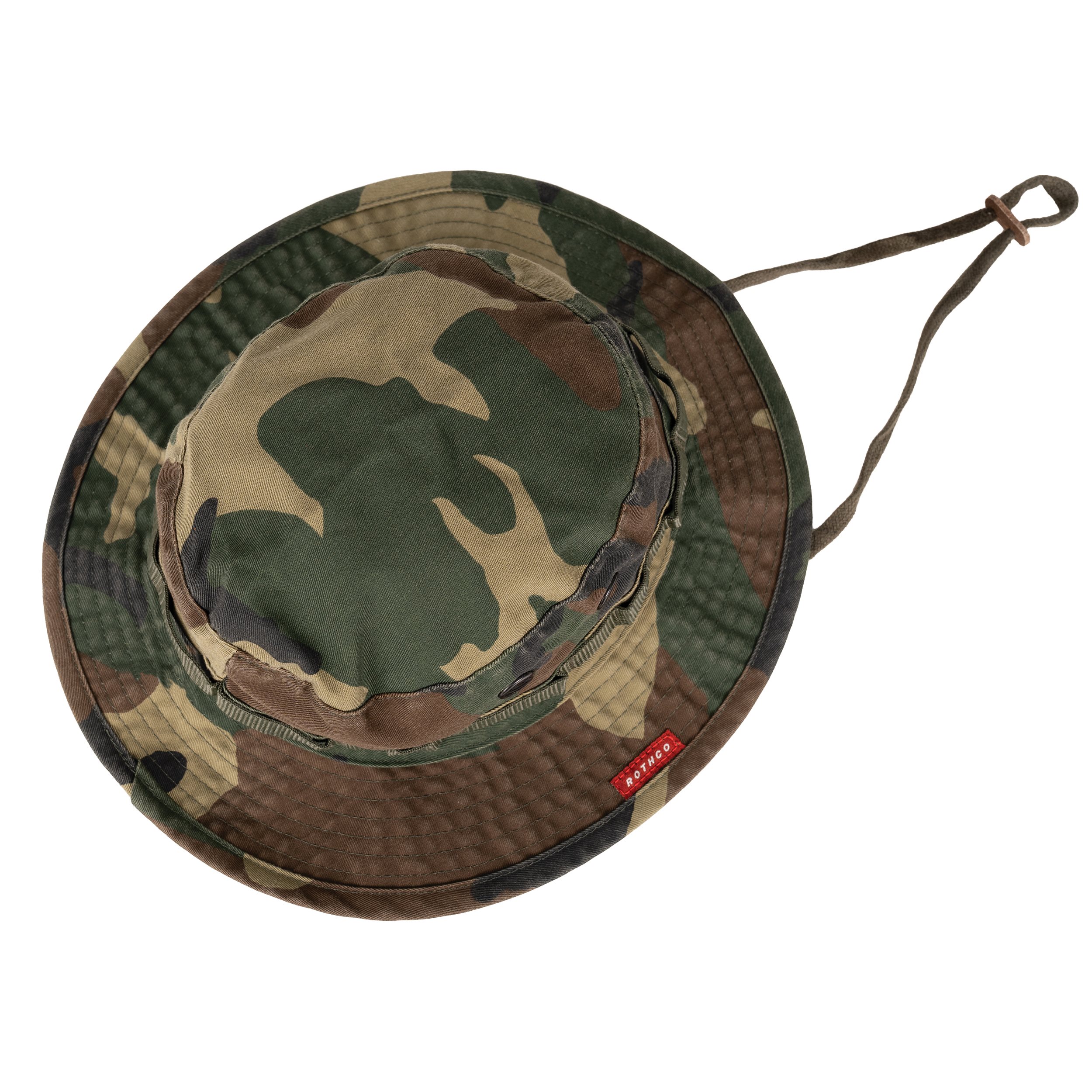 Tento Boonie klobúk od firmy Rothco je vo vintage úprave. Má štyri ventilačné otvory (s mriežkou), šnúrku pod krk s koženou zarážkou a pútka po obvode klobúka na upevnenie dodatočnej kamufláže (tzv. foliage ring).