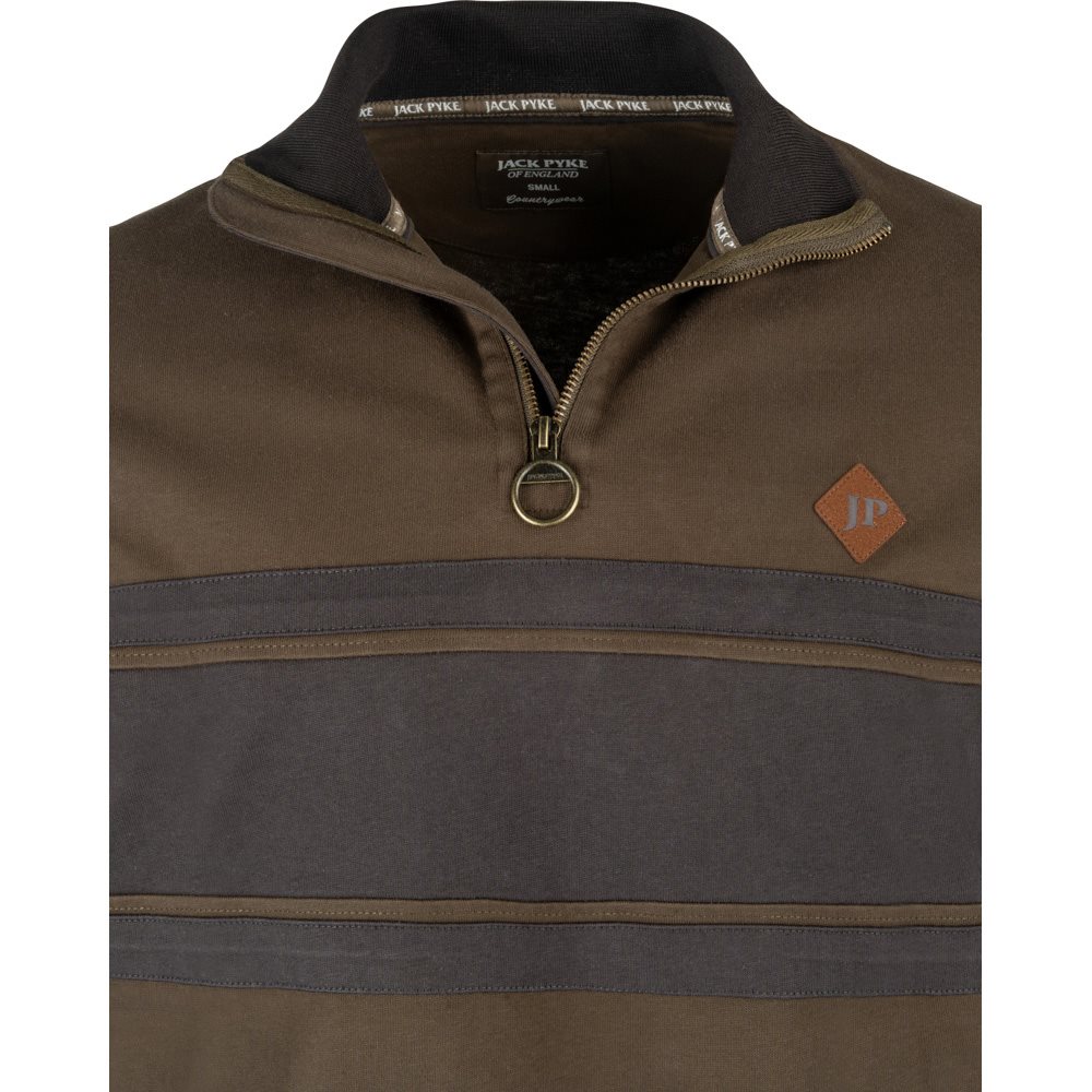 Pohodlná mikina s kontrastným stredovým panelom a elastickými manžetami. Mikina je vyrobená zo zmesi 80 % bavlny a 20 % polyesteru, ktorá je teplá a príjemná na dotyk. Mikina má zvýšený golier a kovový zips s kovovým krúžkom. Na hrudi je jemné logo Jack Pyke.