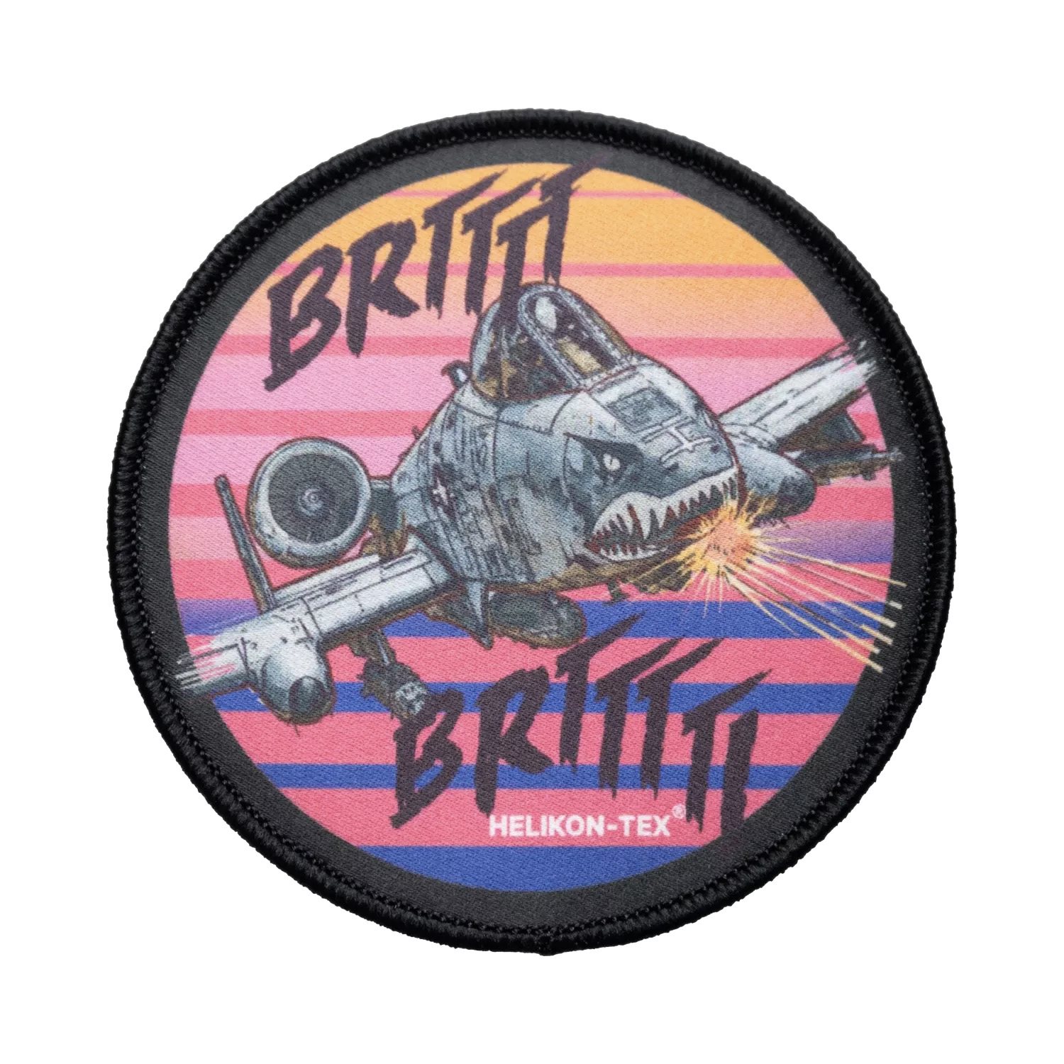 Kruhová retro nášivka s vyobrazením legendárneho lietadla Fairchild Republic A-10 Thunderbolt II, ktoré sa preslávilo svojou odolnosťou a nezameniteľným zvukom, ktorý vydáva jeho 30 mm rotačný kanón GAU-8/A Avenger.