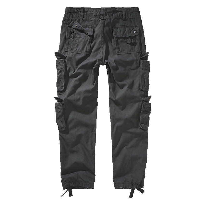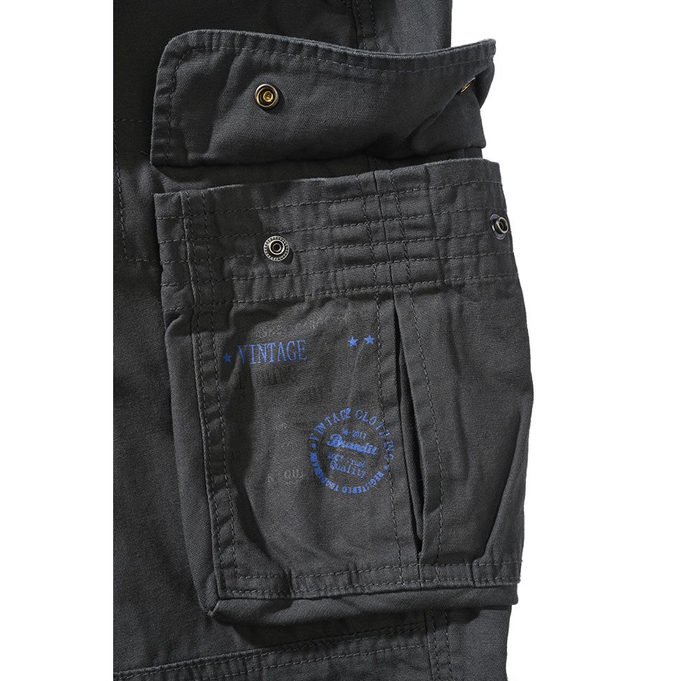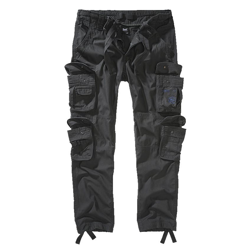 Pohodlné nohavice slim strihu vyrobené z robustnej bavlnenej látky vo vintage štýle. Nohavice sa zapínajú na gombíky a v prípade potreby je možné ich v páse stiahnuť pomocou šnúrky. V páse nájdete pár klasických vreciek na ruky, ktoré sú na stehnách a kolenách doplnené ďalšími štyrmi vreckami s uzatváraním na klopu s patentkami. Manžety nohavíc je možné stiahnuť pomocou látkových pásikov.
