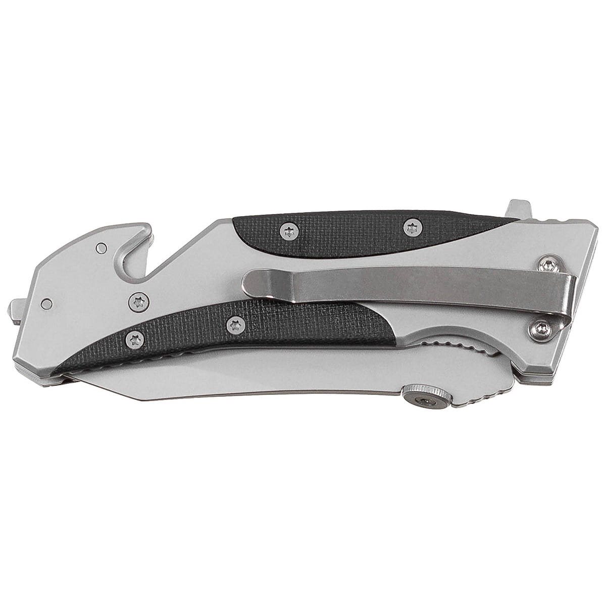 Zatvárací nôž z nerezovej ocele s kovovou rukoväťou s plastovými vložkami. S rezákom pásov, rozbíjačom skla a klipom pre uchytenie k opasku. Dĺžka čepele: 8,5 cm, celková dĺžka: 20 cm.
