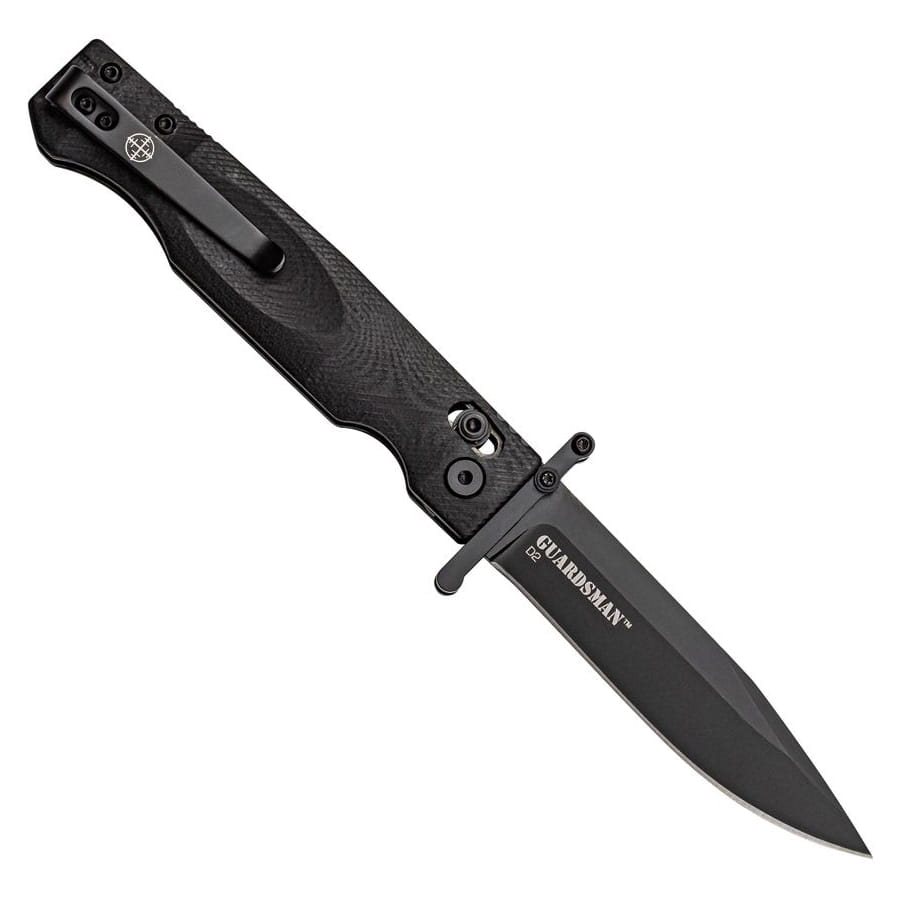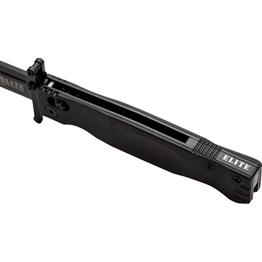 EDC zatvárací nôž v celočiernom prevedení. Čepeľ s hladkým ostrím je vyrobená z nástrojovej ocele D2, v otvorenom stave je nôž istený pomocou poistky typu Rapid lock, ktorej ovládací mechanizmus nájdete v čelnej prednej časti rukoväte. Na rýchle otvorenie jednou rukou slúži lišta s obojstranným kolíčkom, ktorá sa po otvorení čepele zmení na jednoduchú záštitu. Rukoväť je tvarovaná pre príjemný a bezpečný úchop. Jej črienky sú vyrobené z tvrdeného nylonového vlákna. Nôž je opatrený kovovým vreckovým klipom.