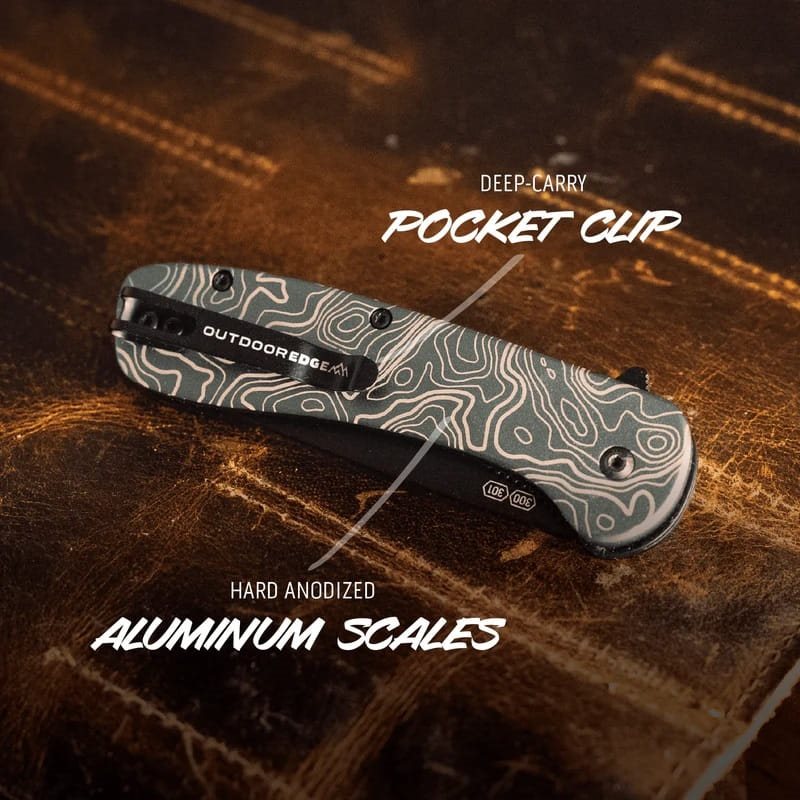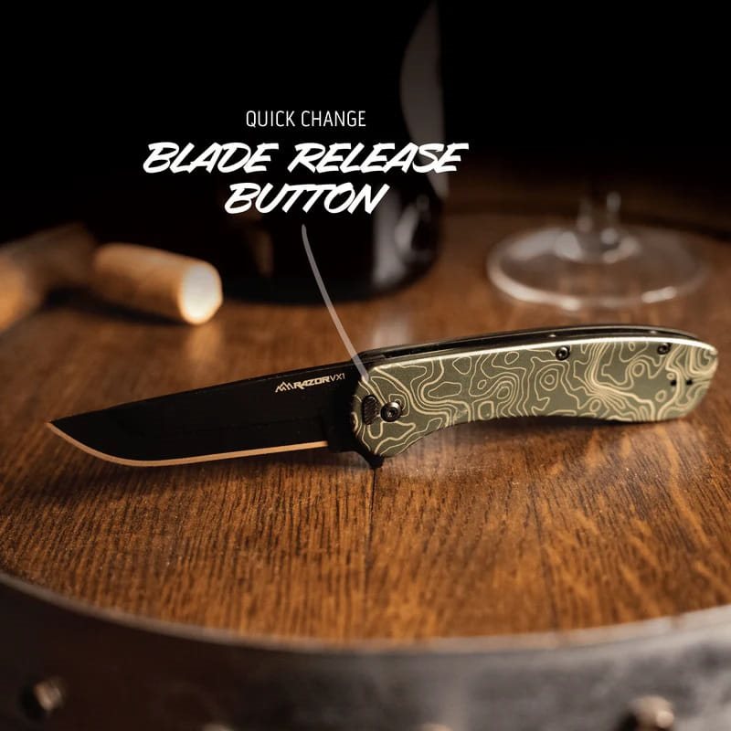 Zatvárací nôž s asistovaným otváraním a možnosťou výmeny ostria. Výmenné Drop point čepele aj držiak na čepele sú vyrobené z nerezovej ocele 420J2 s čierneným povrchom. Na jednoduché otvorenie jednou rukou môžete využiť integrovaný flipper. Rukoväť je mierne zakrivená pre maximálne pohodlný úchop a jej črienky sú vyrobené z hliníka s potlačou pripomínajúcou topografickú mapu. Samozrejmosťou je kovový vreckový klip. K nožu sú dodávané tri výmenné čepele, dve sú s hladkým ostrím, jedna s kombinovaným.