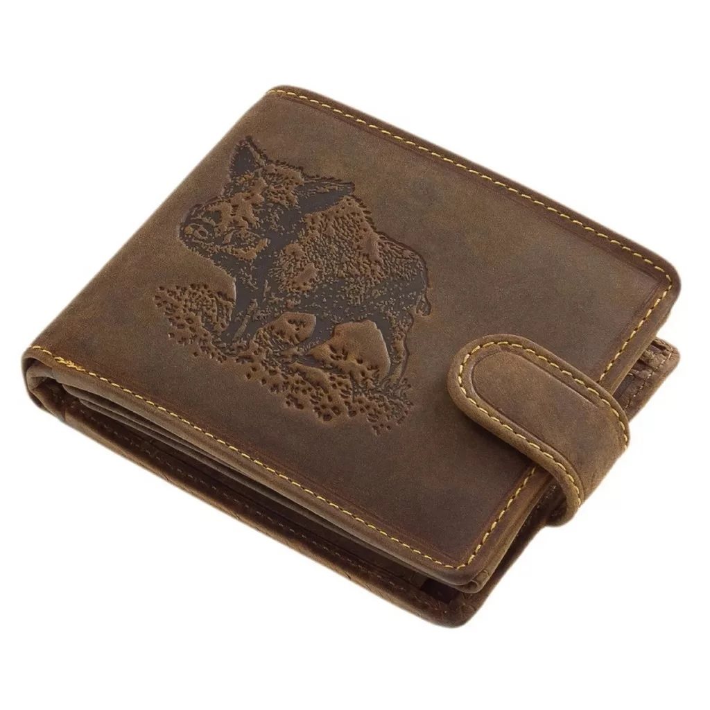 Kvalitne spracovaná peňaženka vyrobená z prémiovej kože s motívom diviaka, uložená v darčekovej krabičke. Zapínanie peňaženky je riešené koženým pásikom s patentkou. Vo vnútri sa nachádza priestor na mince, dve priehradky na papierové bankovky a spolu deväť priehradiek na platobné karty, vizitky a podobne.