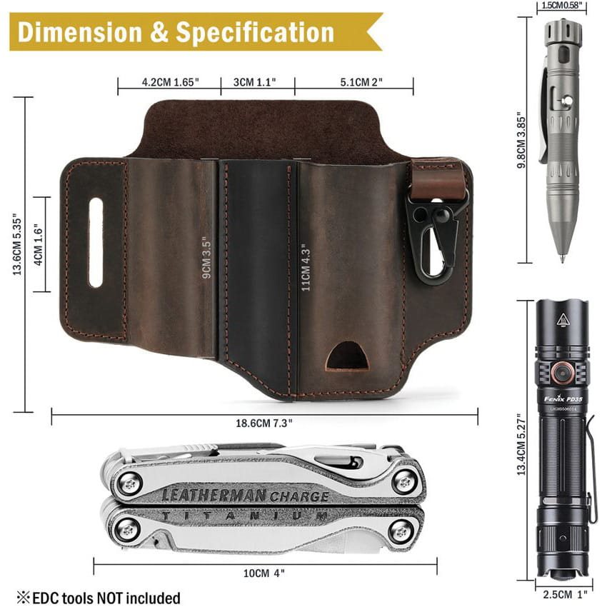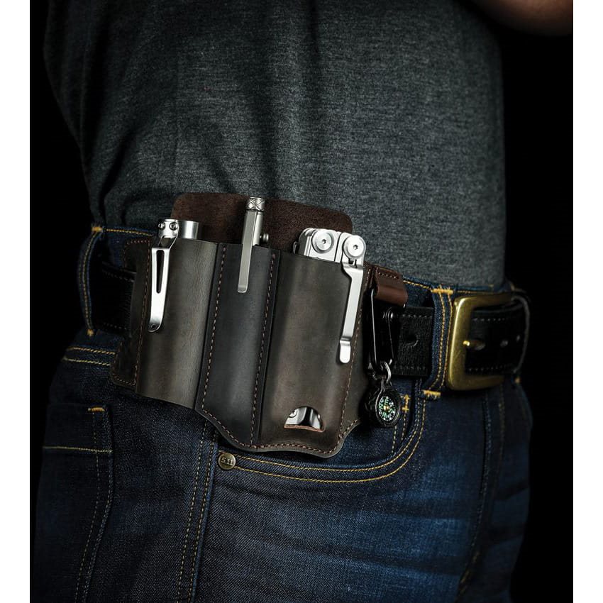 Praktické puzdro na opasok určené na prenášanie multitoolu, taktického pera, baterky atď. Priestor na baterku nemá dno, takže sa do neho bez problémov zmestia aj väčšie baterky. Naopak, priestor na pero má uzavreté dno a pojme písacie potreby s dĺžkou až 9,8 cm. Hlavný priestor pre multitool má otvor na dne, ktorý uľahčuje vyberanie nástrojov z puzdra. Kovová spona sa dá použiť napríklad na kľúče. Puzdro je vhodné pre opasky s šírkou do 4 cm. Na výrobu puzdra bola použitá mäkká, ale odolná koža.