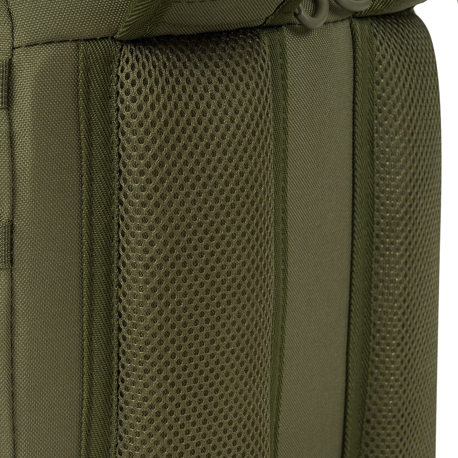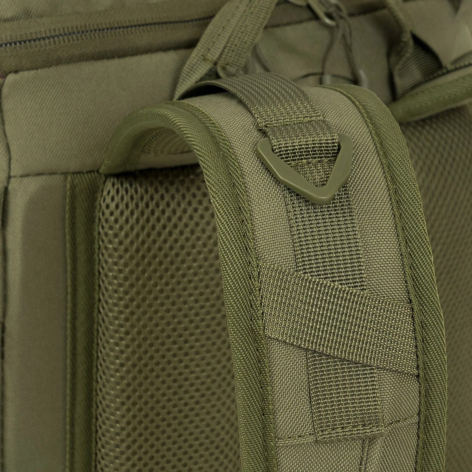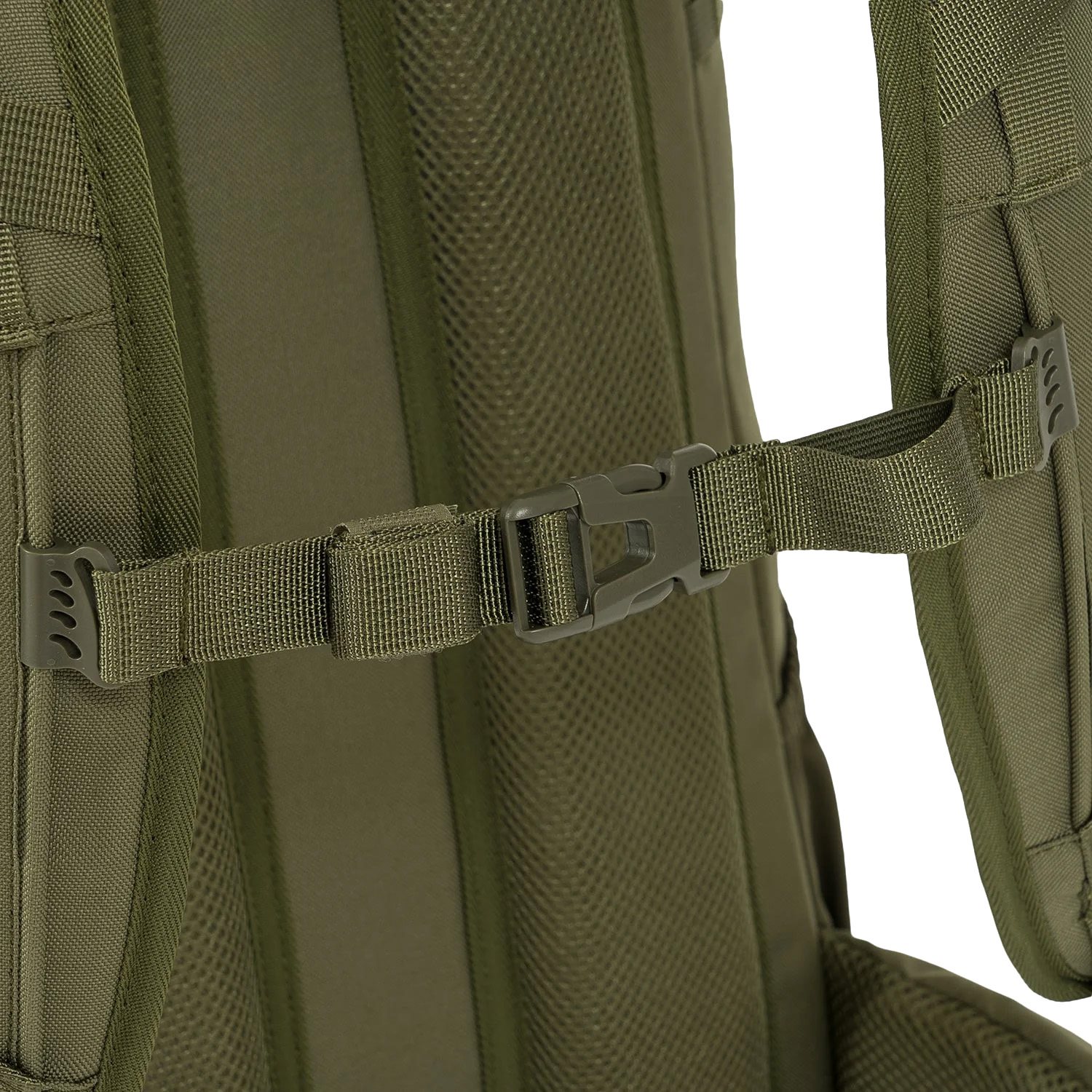 Chrbát plecniaka je bohato polstrovaný pomocou 3D sieťoviny, ktorej tvar zachováva stredový kanálik zlepšujúci odvetrávanie. V hornej časti chrbta nájdete klasické látkové madlo na prenášanie. Nosné popruhy sú plne nastaviteľné, polstrované, disponujú stabilizačnými popruhmi, plastovými trianglami, prievlakmi na pretiahnutie hadičky hydratačného vaku a výškovo nastaviteľným elastickým hrudným popruhom, ktorý je spínaný plastovou prackou. Bedrák batohu je čiastočne polstrovaný, spínaný plastovou prackou a na oboch stranách disponuje menšími vreckami uzatváranými zipsom. Na bokoch batohu nájdete tri rady redukovanej MOLLE/PALS väzby a elastické vrecká. Hlavná chlopňa batohu je vybavená pruhom MOLLE/PALS väzby, priestrannou stredovou priehradkou, vrchným vreckom a malým VELCRO panelom.