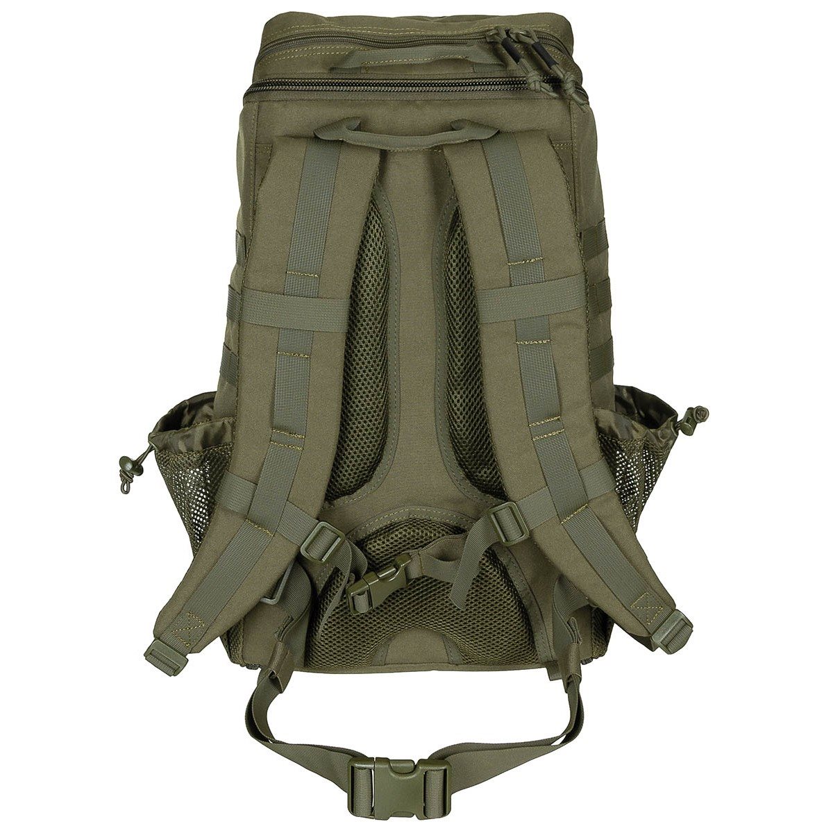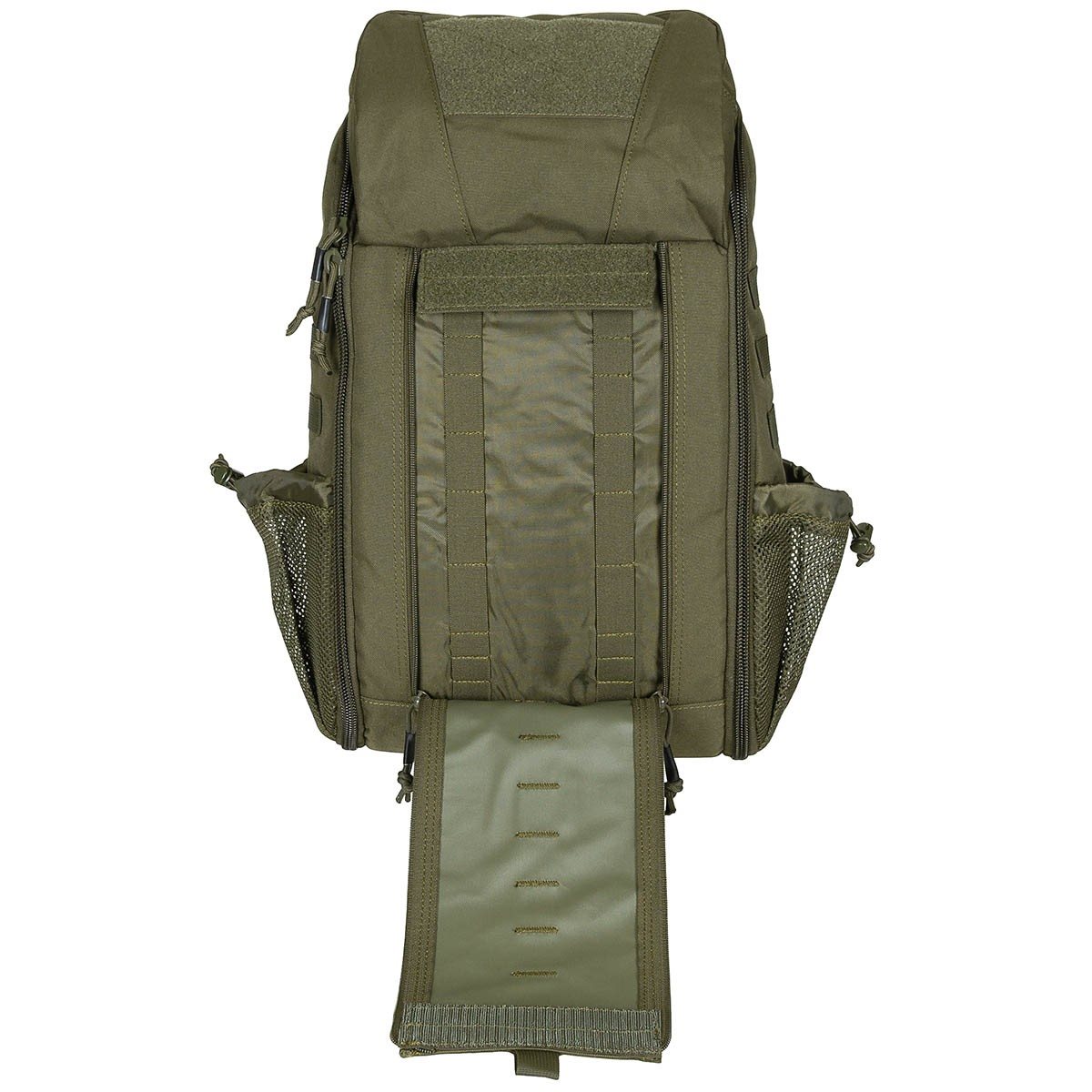 Predný panel so suchým zipsom a skrytými radmi pútok (guma, rôzne veľkosti), kryt zaistený zipsom a suchým zipsom, bočné sieťované vrecká s gumičkou a zarážkami