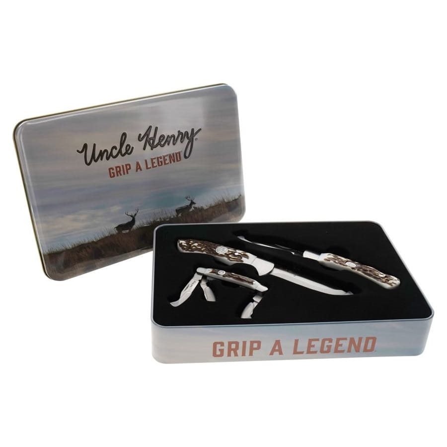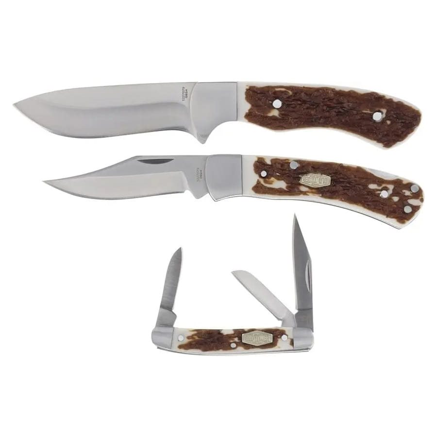 Set celkom troch nožov z nerezovej ocele dodávaný v darčekovej nerezovej krabičke. Všetky tri nože disponujú štýlovou rukoväťou z materiálu Delrin, ktorá svojim vzhľadom pripomína rohovinu. V sete nájdete nôž s pevnou čepeľou, zatvárací nôž a náraďový nožík.