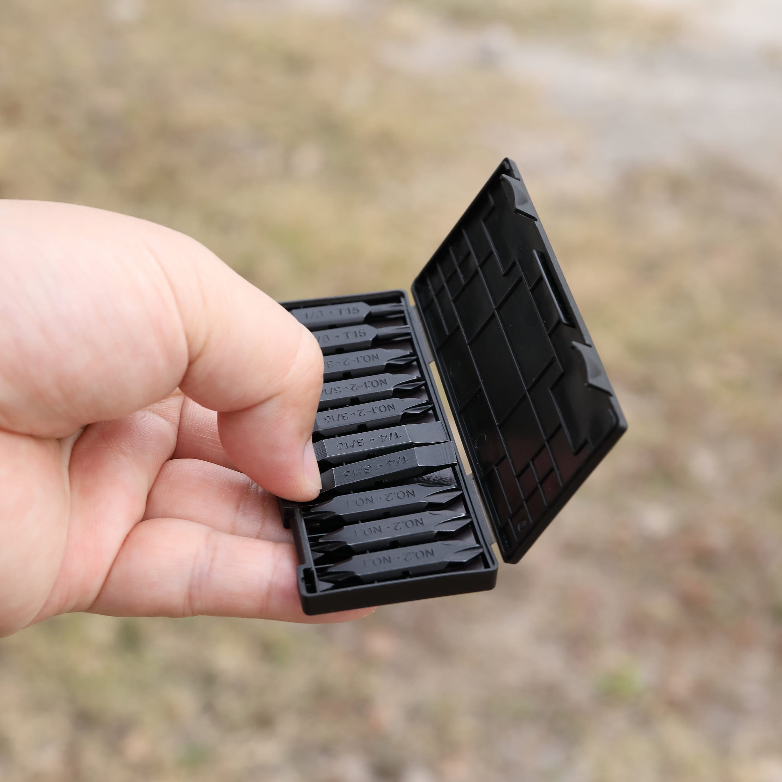 Dodatočná sada plochých bitov určených pre náradie POCKET TOOL a FLAGSHIP CAPTAIN. Bity sú vyrobené z nárazuvzdornej uhlíkovej ocele S2, ktorá sa vyznačuje výnimočnou odolnosťou a húževnatosťou. Príjemným bonusom je kompatibilita bitov s multitoolmi, ako sú LEATHERMAN Surge, Wave+, Signal atď. Bity sa dodávajú v kompaktnom polypropylénovom puzdre.