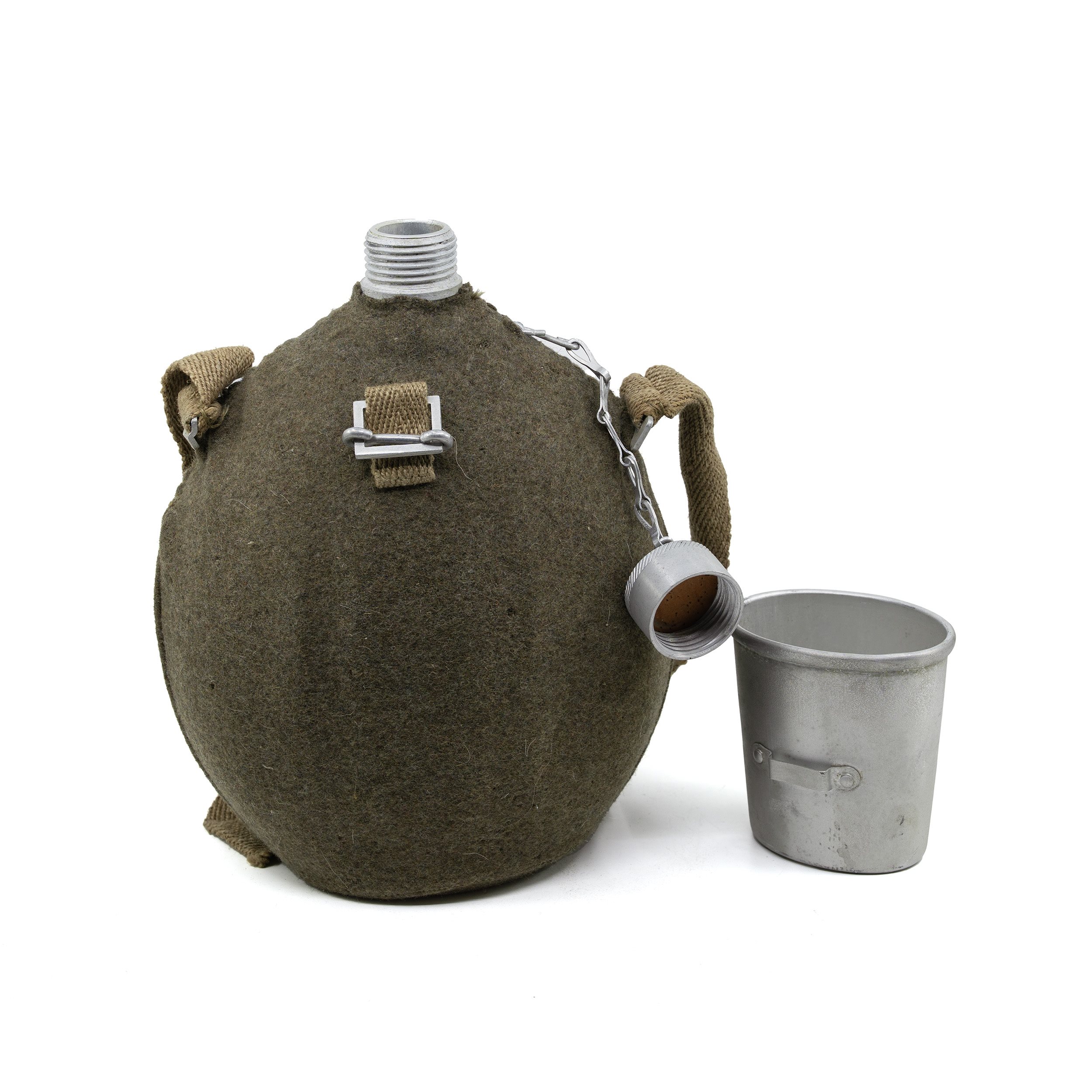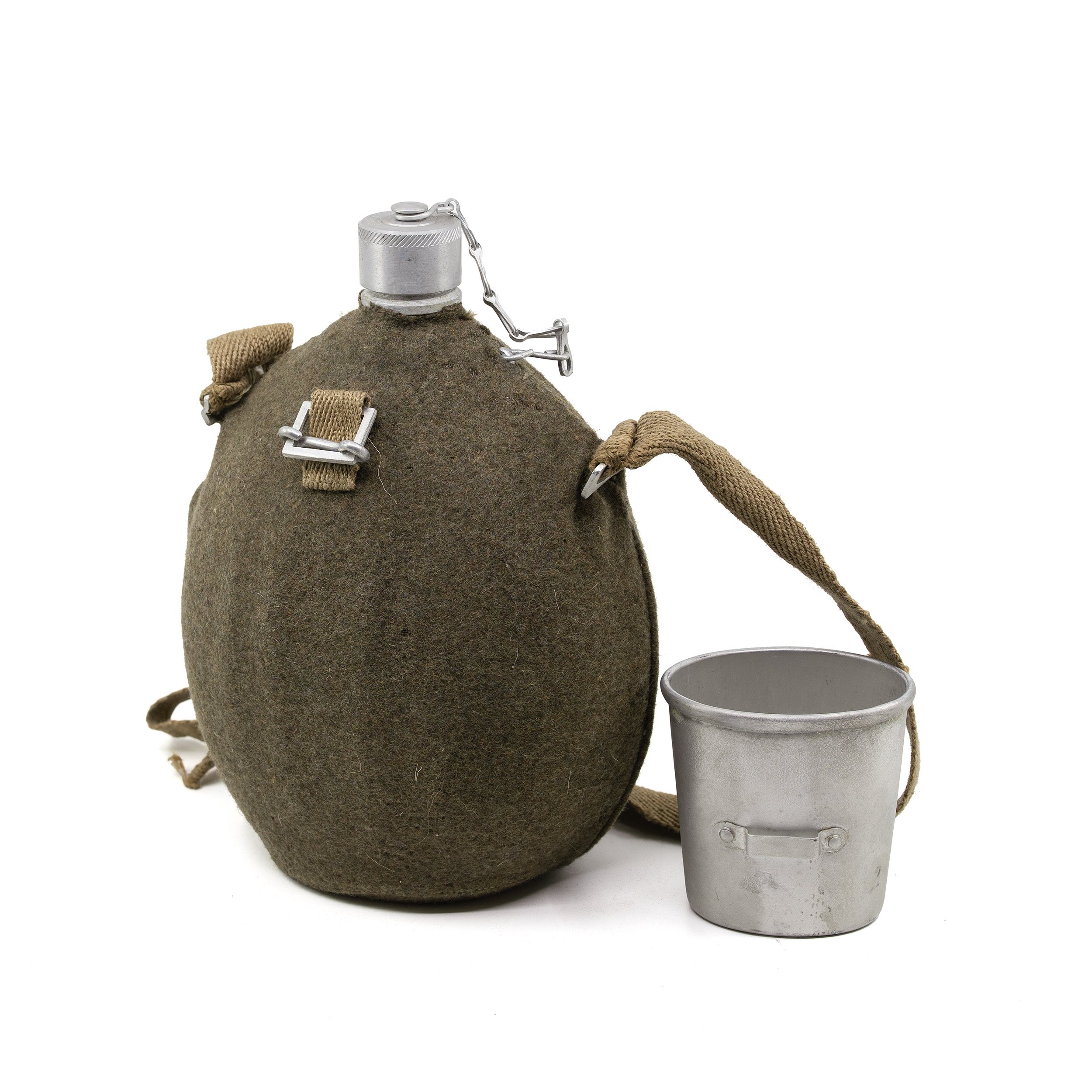 Stará povojnová hliníková fľaša z talianskej armády. Rozmery: cca 27 x 18 x 11 cm. Dlhodobo skladované zásoby. Väčšinou nové alebo mierne použité, ale vykazujú známky opotrebenia na vonkajšej strane v dôsledku skladovania a manipulácie. Plstený obal môže byť poškodený molami.