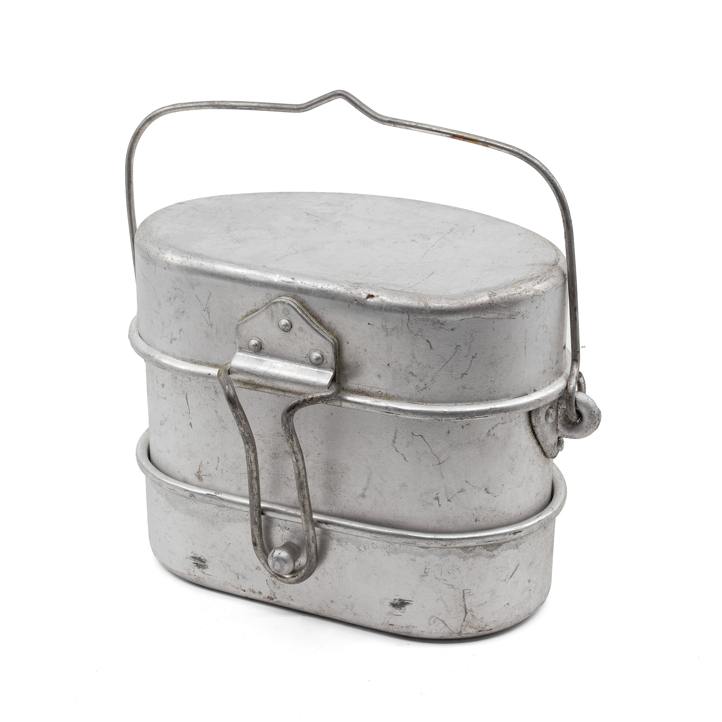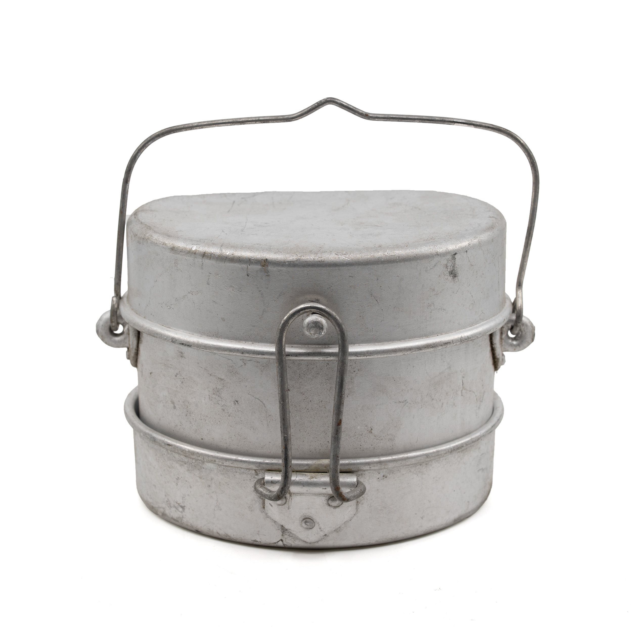 Starý povojnový trojdielny hliníkový riad z talianskej armády. Rozmery približne 16 x 10 x 13 cm. Dlhodobo skladované zásoby. Väčšinou nové alebo mierne použité, ale vykazujú známky opotrebenia v dôsledku skladovania a manipulácie.