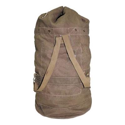 Plátenný batoh na výstroj. Sťahovanie na povrázok prevlečený kovovými okami. Popruhy na ramená. Použitý. Ďalšie informácie