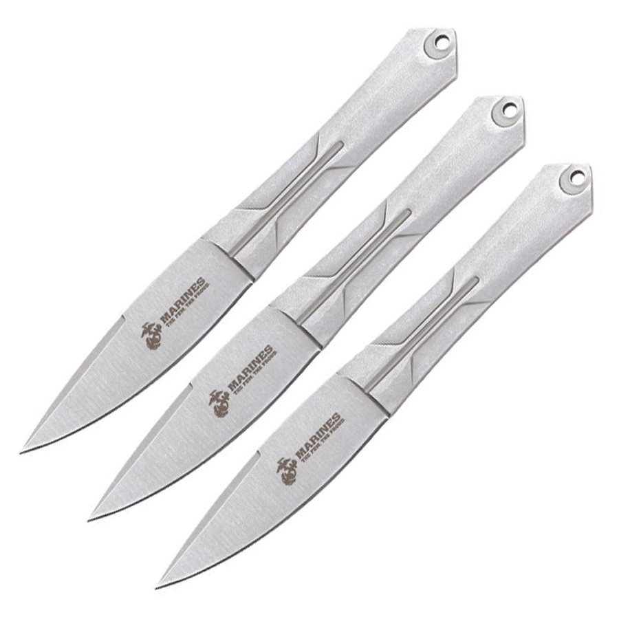 Set troch špičkovo vyvážených nerezových nožov s oficiálne licencovaným logom USMC. Nože sú vyrobené z jedného kusu nerezovej ocele s "opranou" stonewash povrchovou úpravou. Ostrie nožov je hladké a ich špička je extra úzka pre maximálnu penetráciu. Na konci každého noža nájdete otvor na prevlečenie poistnej šnúry. K sade je dodávané nylonové opaskové puzdro s istením pomocou pásikov s cvokom.